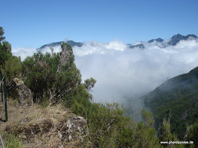 Nachdem mir mein Fehler aufgefallen ist, kehrte Ich um bzw. lief zurück zu der Stelle (mittlerweile hatte Ich 9 Km-600 Hm und 2 Std. Zeit verloren), was mich zurück warf auf Rang12. Nun bei Km 56 angekommen verpflegte Ich mich mit guter Hühnersuppe denn jetzt begann für die nächsten Stunden ein ständiges Auf und Ab über alte Treppenstufen. Raus aus der Hütte auf mittlerweile aufgeweichtem Boden ( hier in Encumaeda starteten vor Stunden die 55 km Läufer) begannen die Treppenstufen und es ging auf 700 Hm bergauf bis auf eine Höhe von 1640 m. Oben angekommen wieder über Single Trails hinunter dann über Treppen wieder aufwärts im stetigen Wechsel zwischen 1400 und 1780 m. Die zahlreichen Fotos und die Schönheit Madeiras sowie der atemberaubende Ausblick mit Nebel, Sonne und das durchkämmen der Wolkendecke lassen die jetzt etwas schweren Beine vergessen.
