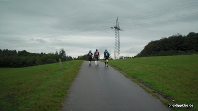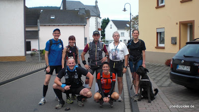 Ab jetzt befinden wir uns auf dem Heimweg nach Schweich. Bei unserem letzten RAVI setzt plötzlich Regen ein. Zum Glück geht es jetzt aufwärts durch einen Wald, dessen Blätterdach uns doch recht gut schützt. als wir den Wald verlassen nieselt es nur noch. Nach 12:30 Std. erreichen wir Km 67 und damit den "Bier-RAVI". Nur noch 30 Minuten bis zum Zeitlimit von 13 Stunden. 5km in 30 Minuten, das bedeutet zwar nur eine 6er Pace wir haben aber fast alle Blasen an den Füßen. Also genießen wir unser Bier, wohl wissend, dass wir alle versagt haben. In der Dunkelheit traben wir die letzten Kilometer nach Schweich. Nach 13:39 Std. erreichen wir wieder unseren Ausgangspunkt. Weit über dem Zeitlimit!