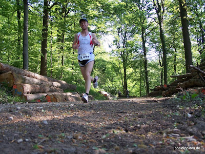 Start war um 9 Uhr, also genug Zeit für eine entspannte Anreise. Kurz nach dem Startschuß machte ich mich in entgegengesetzter Richtung auf den Weg mit meinem MTB. Nun ja, ich hab zwar ein teures Ghost-MTB aber so richtig im Gelände war ich damit ja noch nie. Das merkte ich auch gleich beim ersten Anstieg. Völlig ungeübt, in einem viel zu kleinen Gang strampele ich wie ein "Duracell-Häschen" den Berg hoch, bloß nicht anhalten, sonst kannst du schieben, dachte ich und wie willst du das dann den entgegenkommenden Läufern erklären.